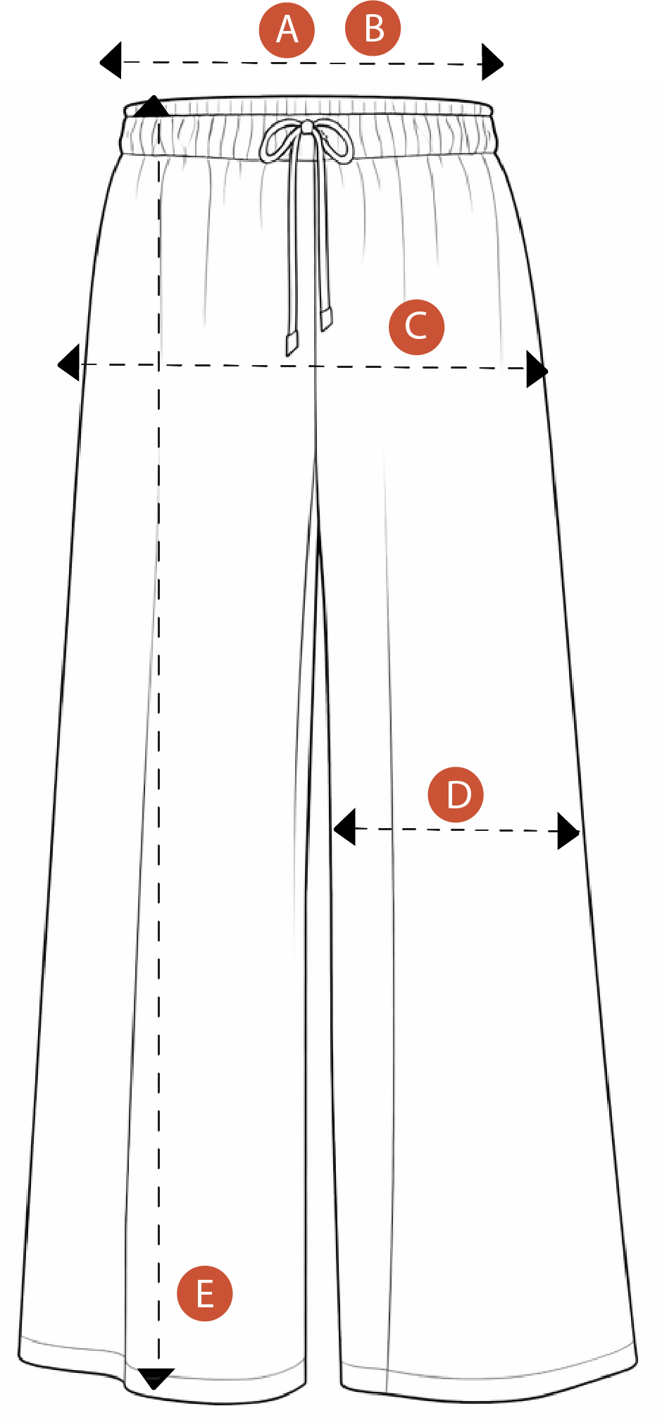 | Talle | A Cintura | B Cintura estirada | C Cadera | D Ancho pierna | E Largo |